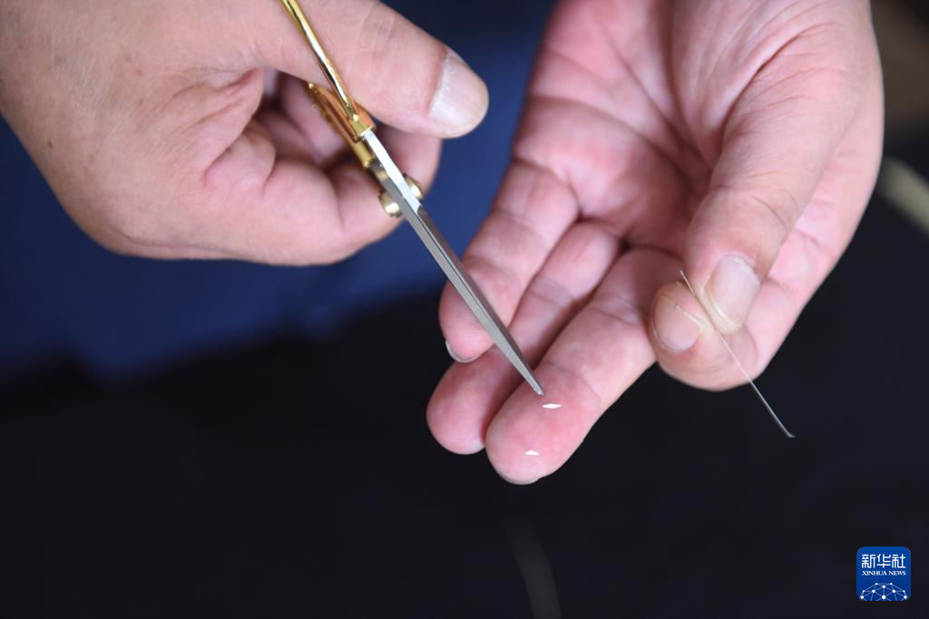 7月12日,吳永龍將細小的“零件”從麥稈做成的條片上剪下。