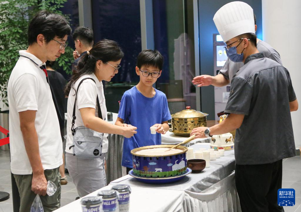 7月21日晚,游客在夜間“那達慕”大會上品嘗奶茶。
