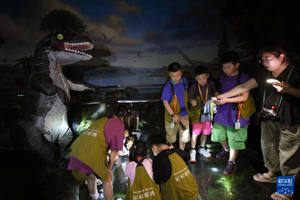 7月26日,參加夜游的孩子們在博物館內了解恐龍。