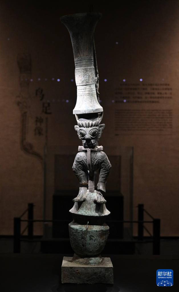 7月26日在三星堆博物館新館拍攝的青銅鳥足曲身頂尊神像。
