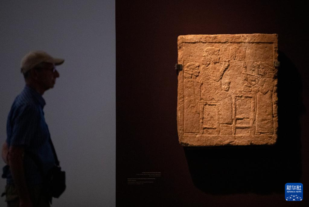 8月2日,參觀者在位于西耶路撒冷的以色列博物館觀看一件呈現古代宴會的裝飾品。