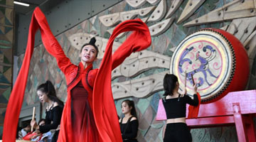 8月8日,參加暑期社會實踐的大學生在活動開幕式現場表演節目。