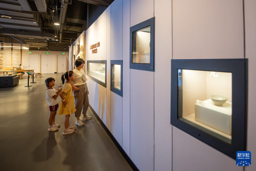 8月9日,在杭州西站候車的旅客帶著孩子參觀“西站兩千年——李家塘遺址文物展”。