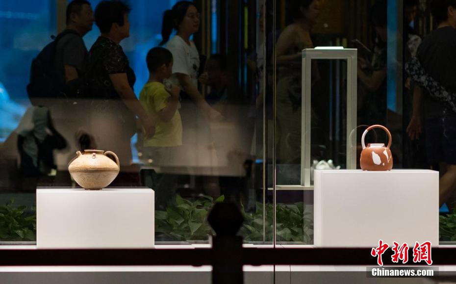 大報恩寺遺址博物館展出的五代時期青釉瓷執壺(左)、清代紫砂提梁壺(右)。泱波 攝