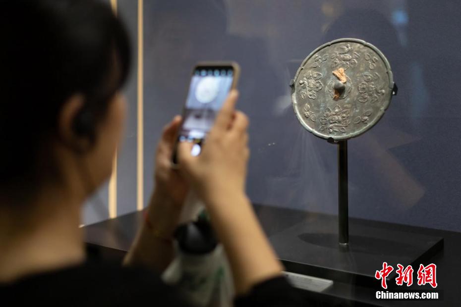 圖為觀眾拍攝展出的唐代花鳥紋銅鏡。 泱波 攝