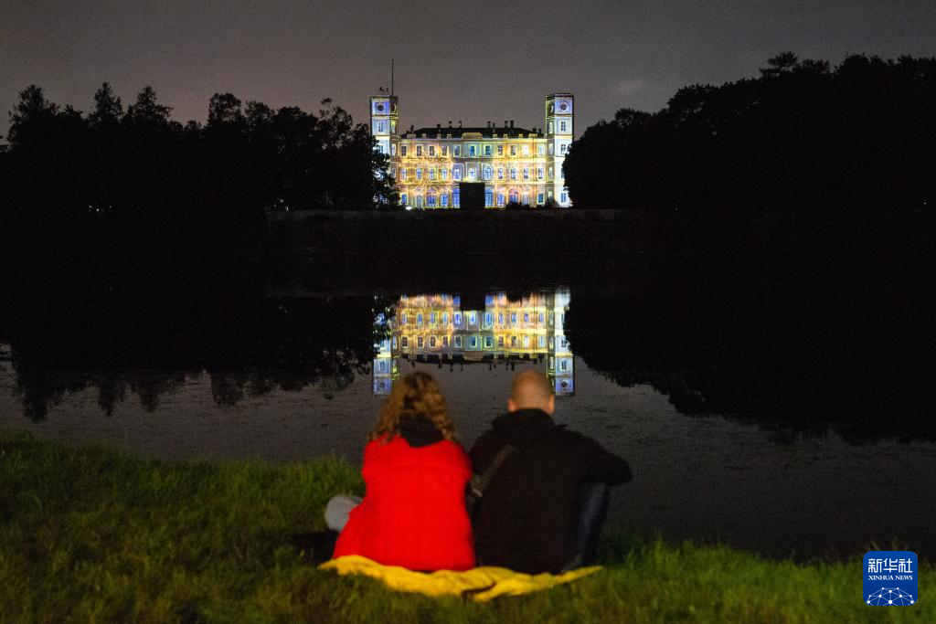8月19日,民眾在俄羅斯圣彼得堡附近的加特契納宮觀賞燈光秀。