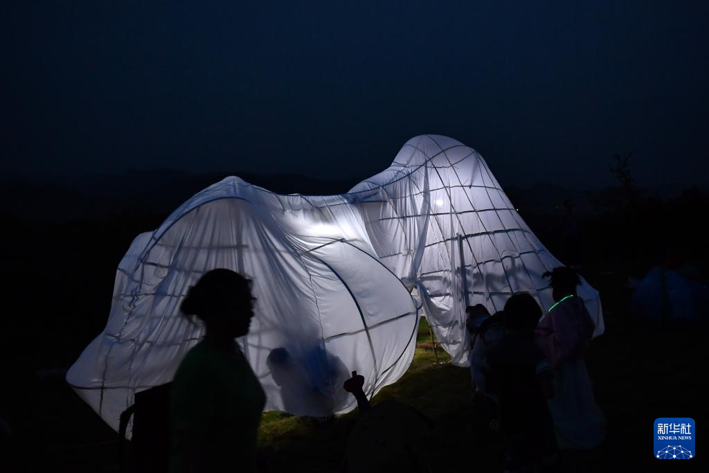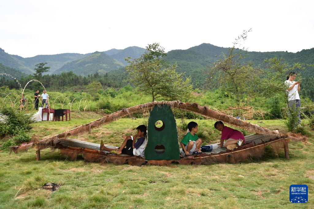 這是老師、志愿者和孩子們用樹枝、竹篾搭建的裝置藝術作品“云朵屋”(8月20日攝)。