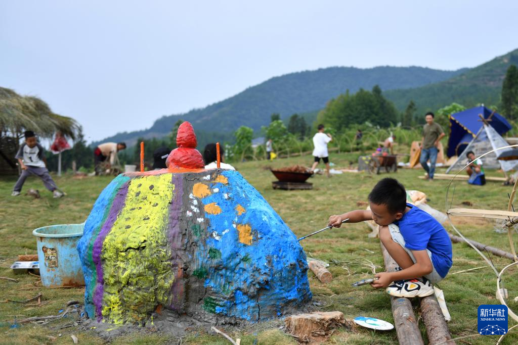 8月19日,小朋友在大元社草坪劇場的陶土裝置上繪畫。