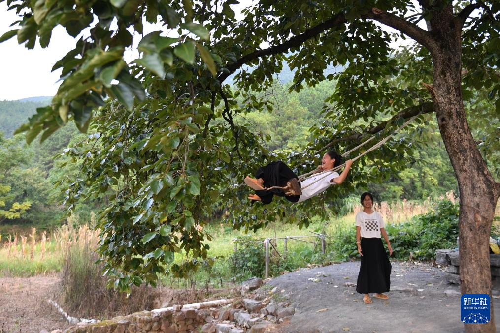 8月19日,孩子們在晚餐后蕩秋千玩耍。