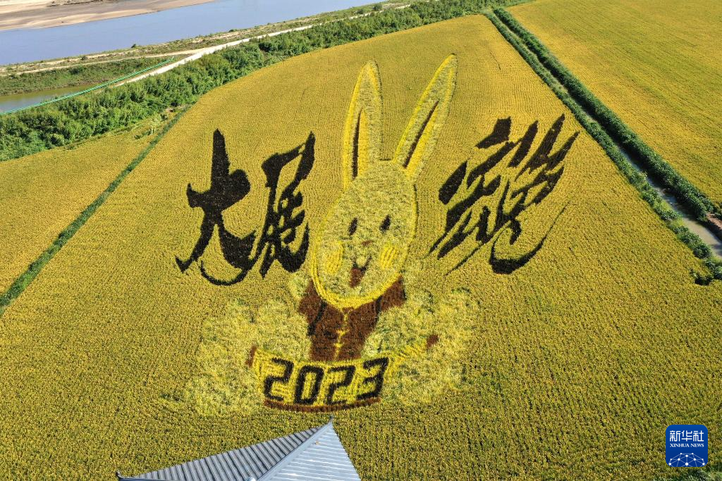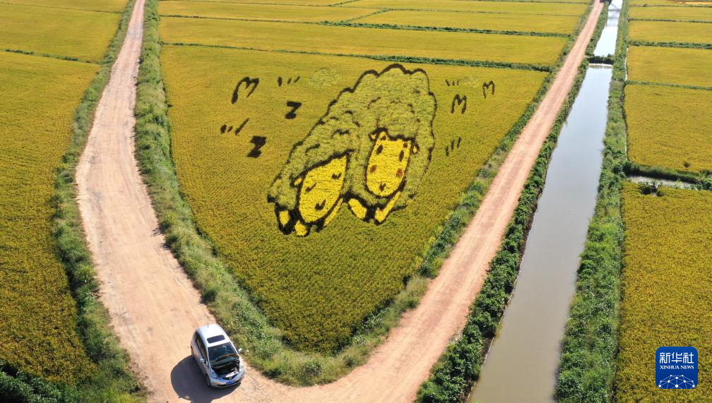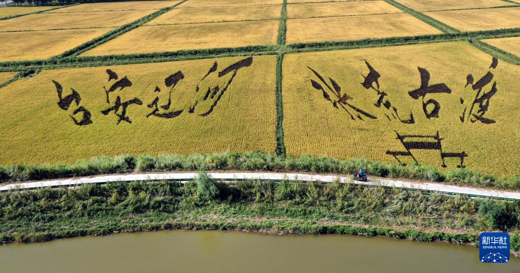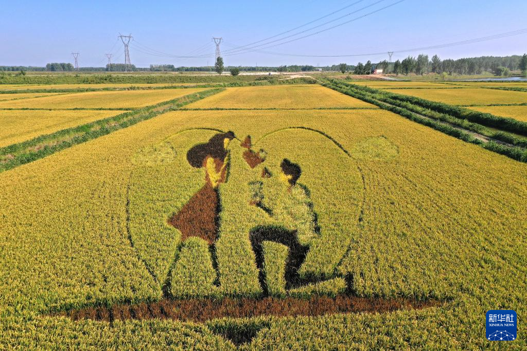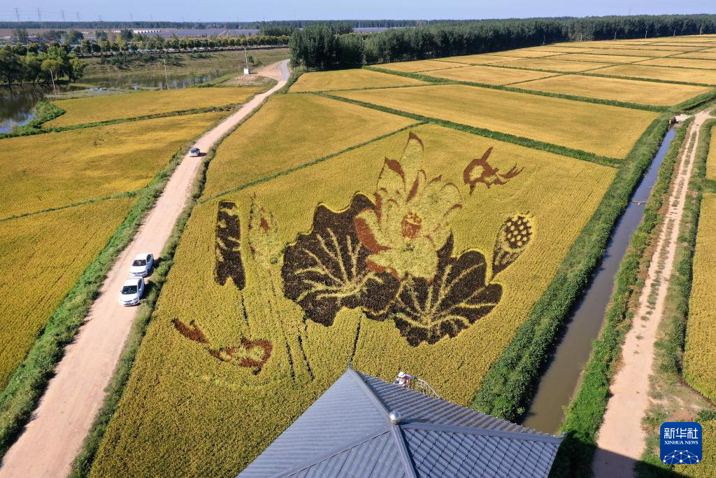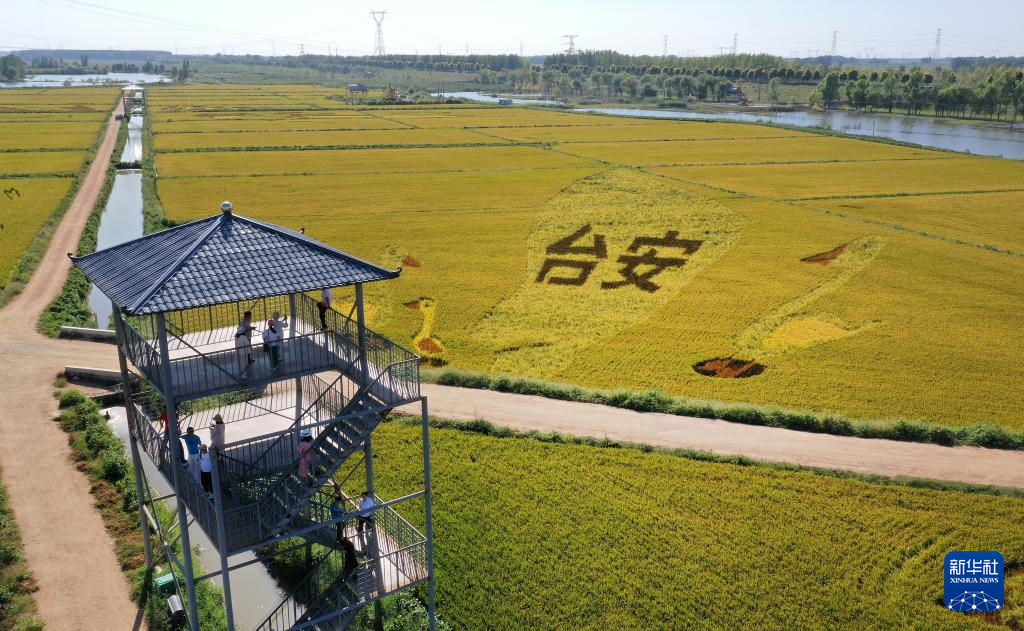 初秋時節,遼寧省鞍山市臺安縣遼河文化旅游景區的稻田畫吸引不少游客前來參觀游覽。由多種顏色組成的巨型稻田畫勾勒出豐收壯美景象。