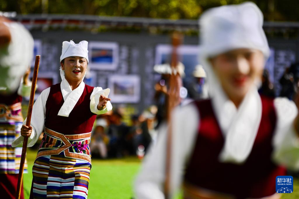 在拉薩市林周縣邊交林鄉當杰村,演員在第十六屆西藏珠穆朗瑪攝影大展開幕式上表演節目(9月8日攝)。