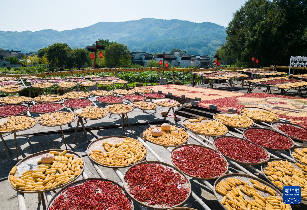 地處皖南山區的安徽省黃山市徽州區呈坎古村自古都有曬秋習俗。近年來,曬秋時節,該村村民會將農作物在村中廣場集中晾曬,構成一幅五谷豐登的秋收畫卷,吸引不少游客前往觀賞,成為當地秋日里的旅游特色。