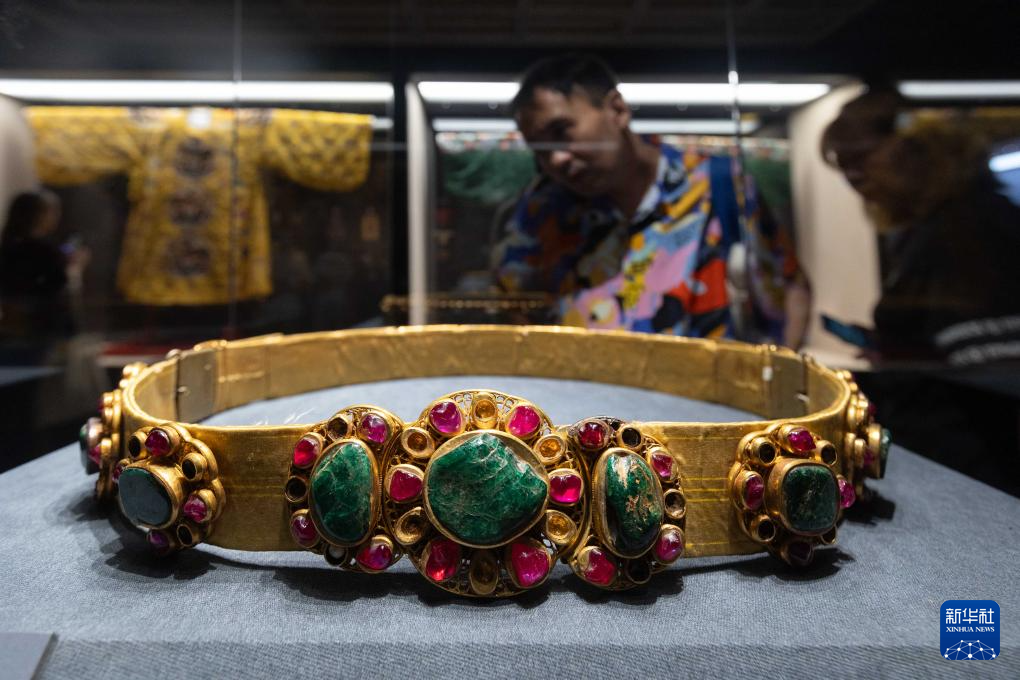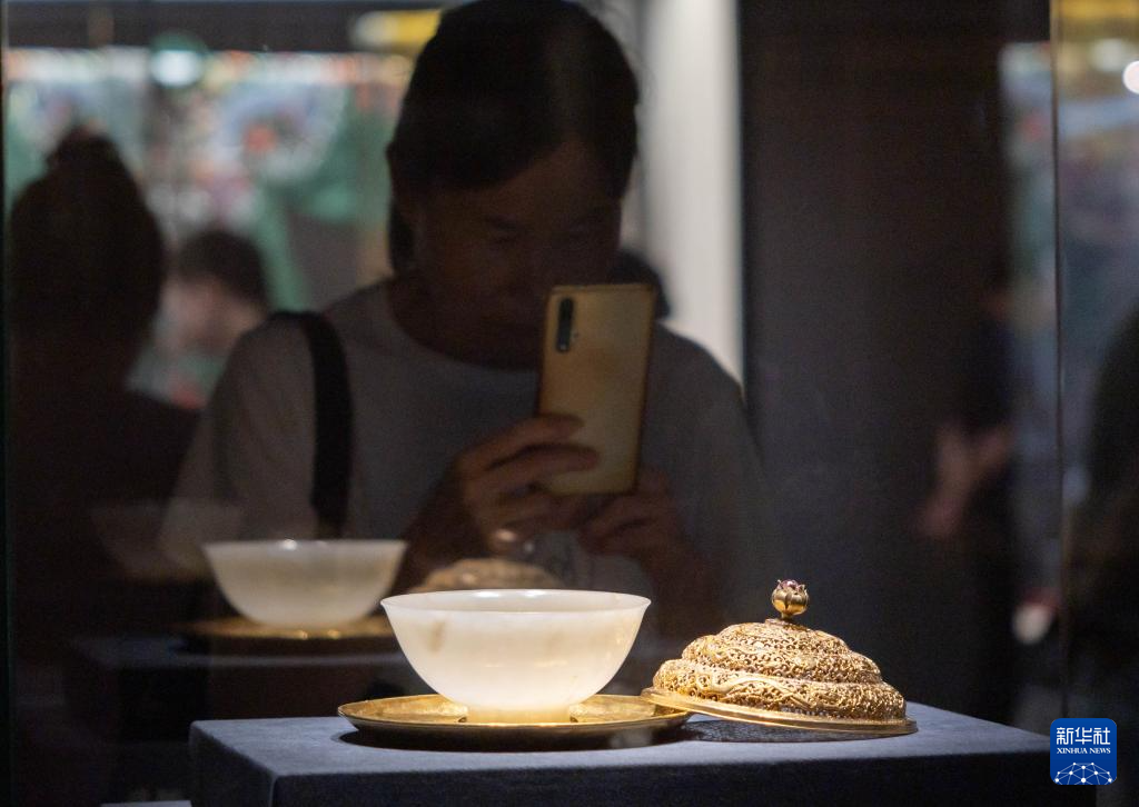 9月15日,觀眾在展覽上拍攝鏤空金蓋金托盤玉碗。