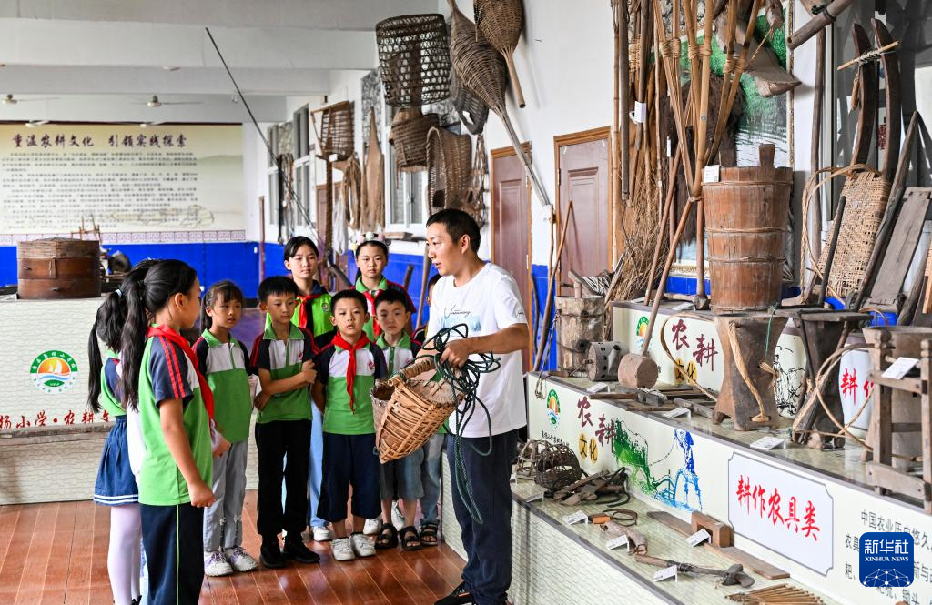 9月20日,重慶市忠縣烏楊小學教師在向農耕文化社團的學生介紹農具。