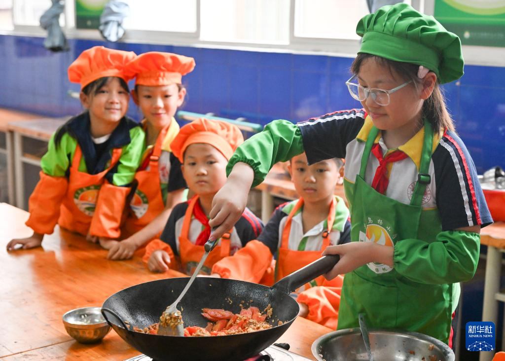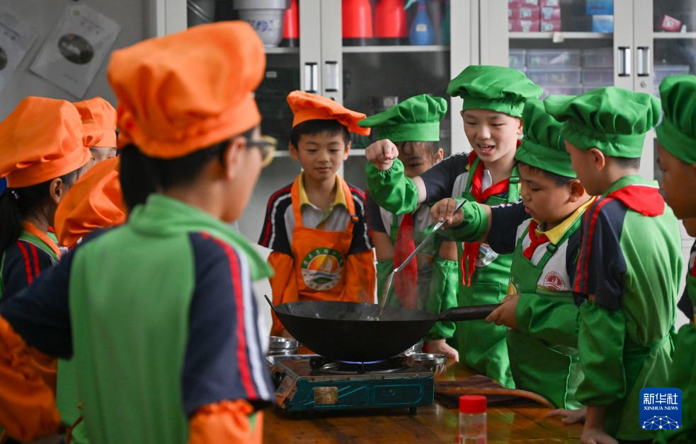 9月20日,重慶市忠縣烏楊小學廚藝社團的學生在學習、體驗炒菜。