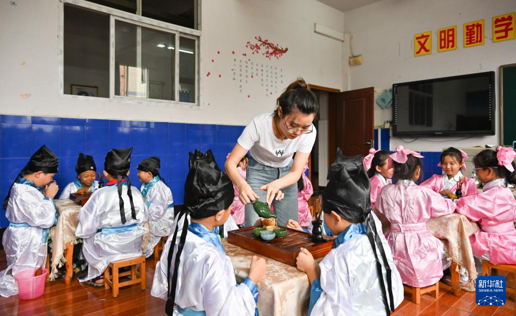 9月20日,重慶市忠縣烏楊小學茶藝社團的學生在學習茶藝。