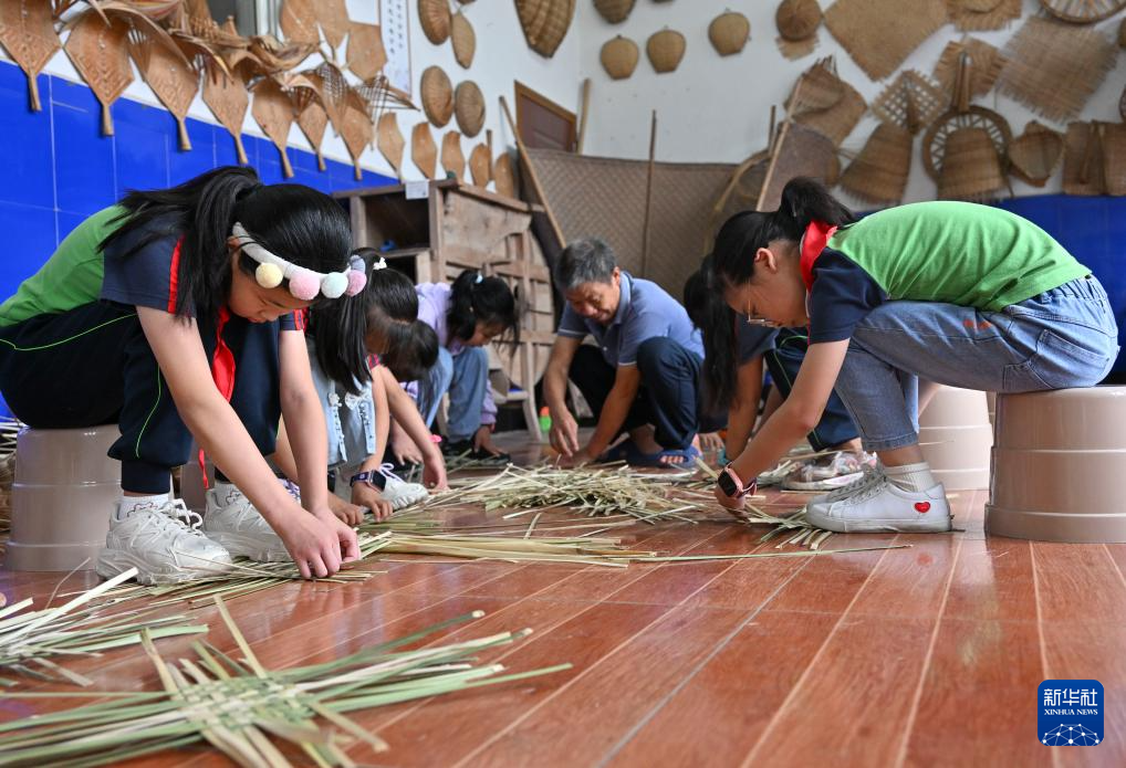 9月20日,重慶市忠縣烏楊小學農耕文化社團的學生在學習、體驗竹篾編制。