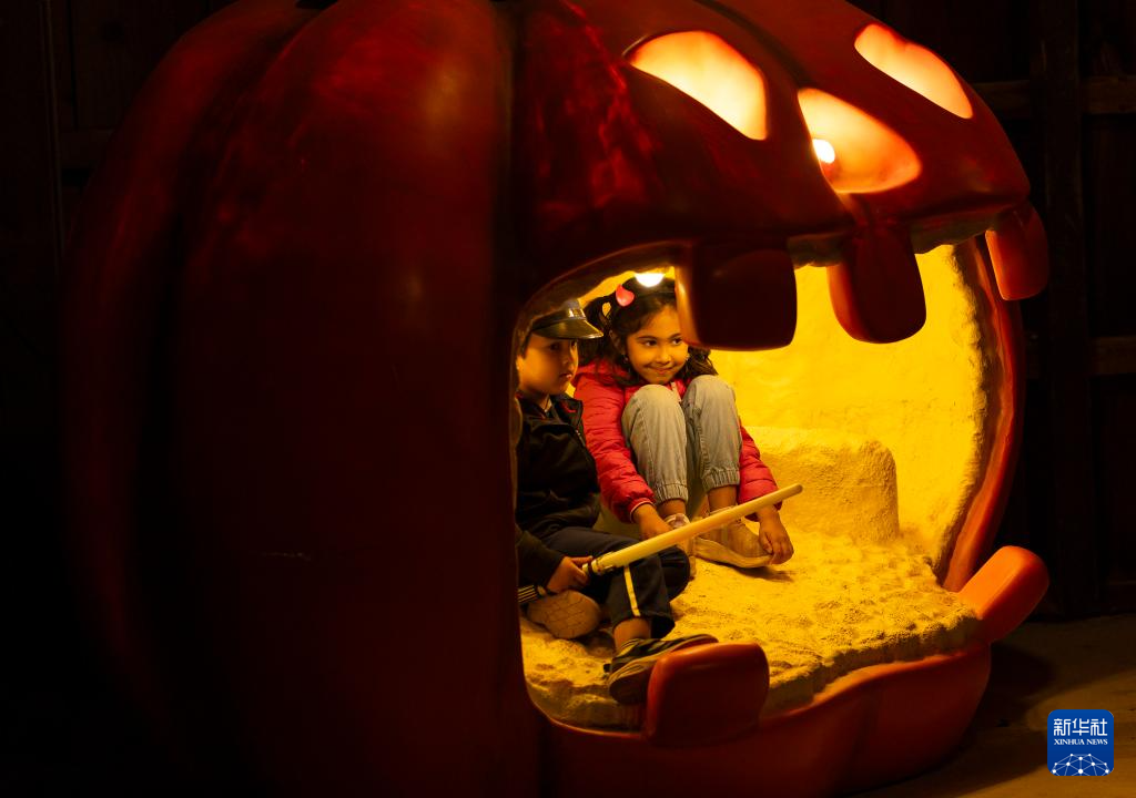 9月23日,在加拿大安大略省米爾頓舉辦的南瓜燈展上,兩名兒童在一個南瓜燈中拍照。