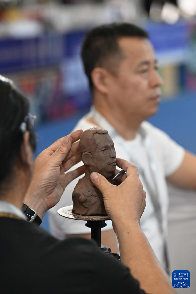 9月30日,工作人員在交易會上展示人物泥塑創作。