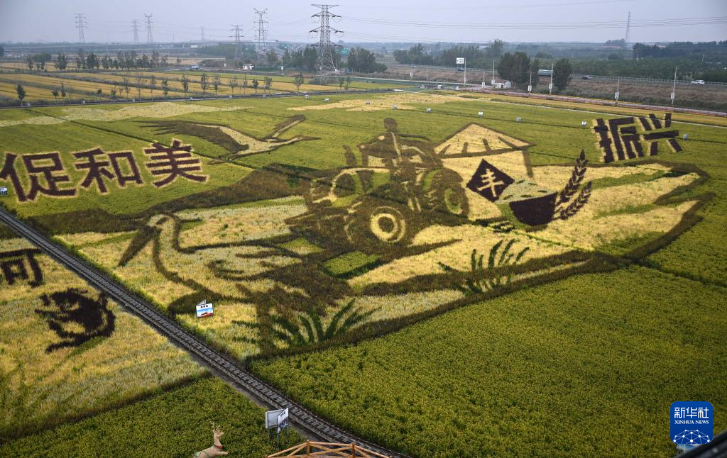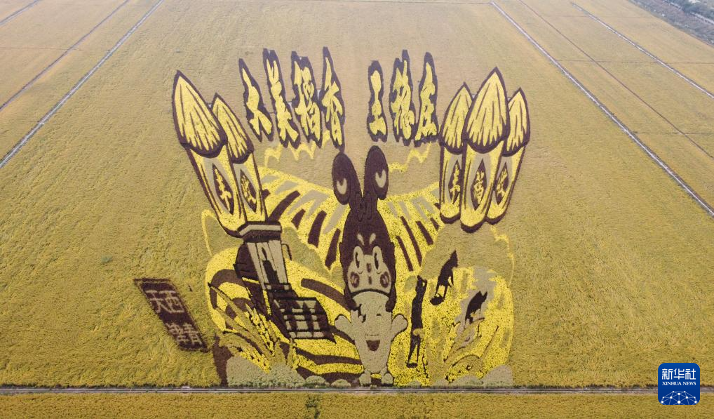 天津市寧河區七里海寧和稻香農旅生態園中的稻田畫(10月8日攝)。
