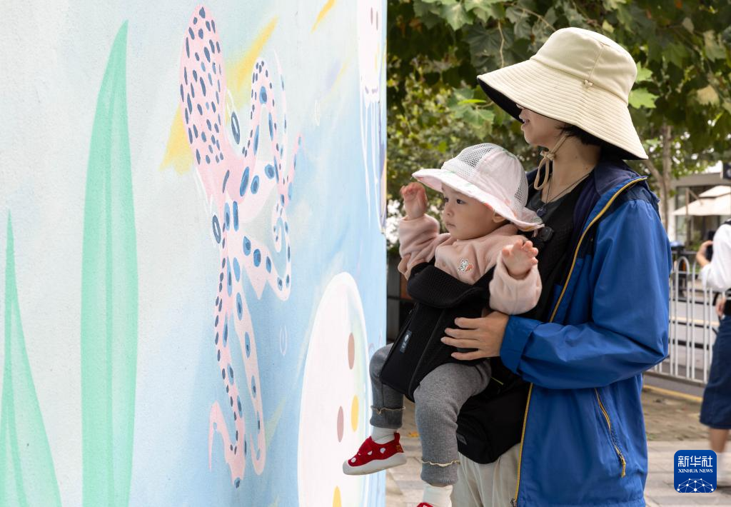 10月9日,市民帶著小孩在上海光華創意街區一處涂鴉墻前駐足觀看。