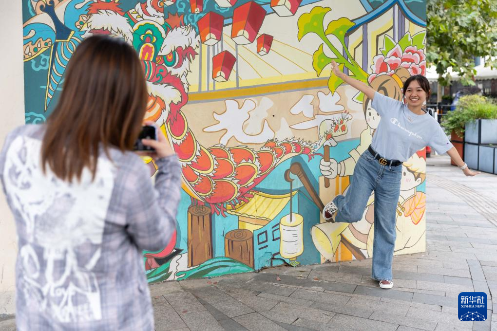 10月9日,市民在上海光華創意街區一處藝術涂鴉墻前拍照。