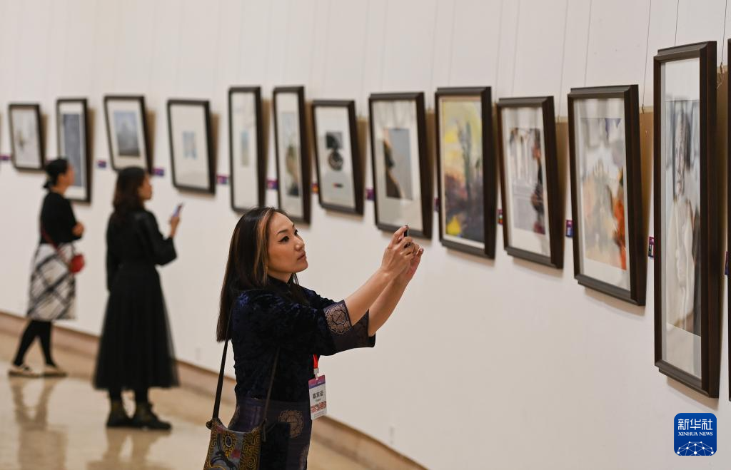 10月24日,參展嘉賓在陜西省美術博物館欣賞藝術作品。