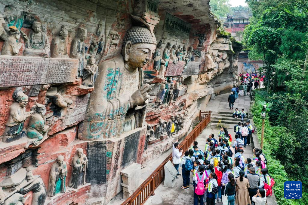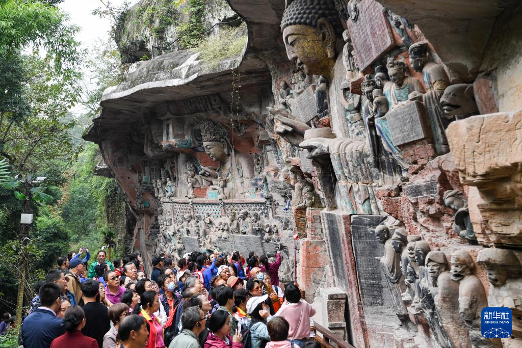 11月1日,游客在大足石刻景區游覽(無人機照片)。