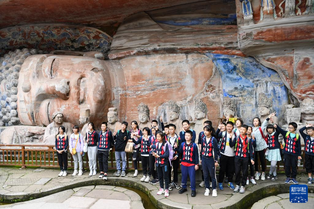 11月1日,參加研學活動的學生在大足石刻景區留影。