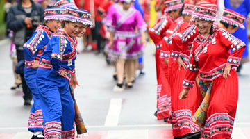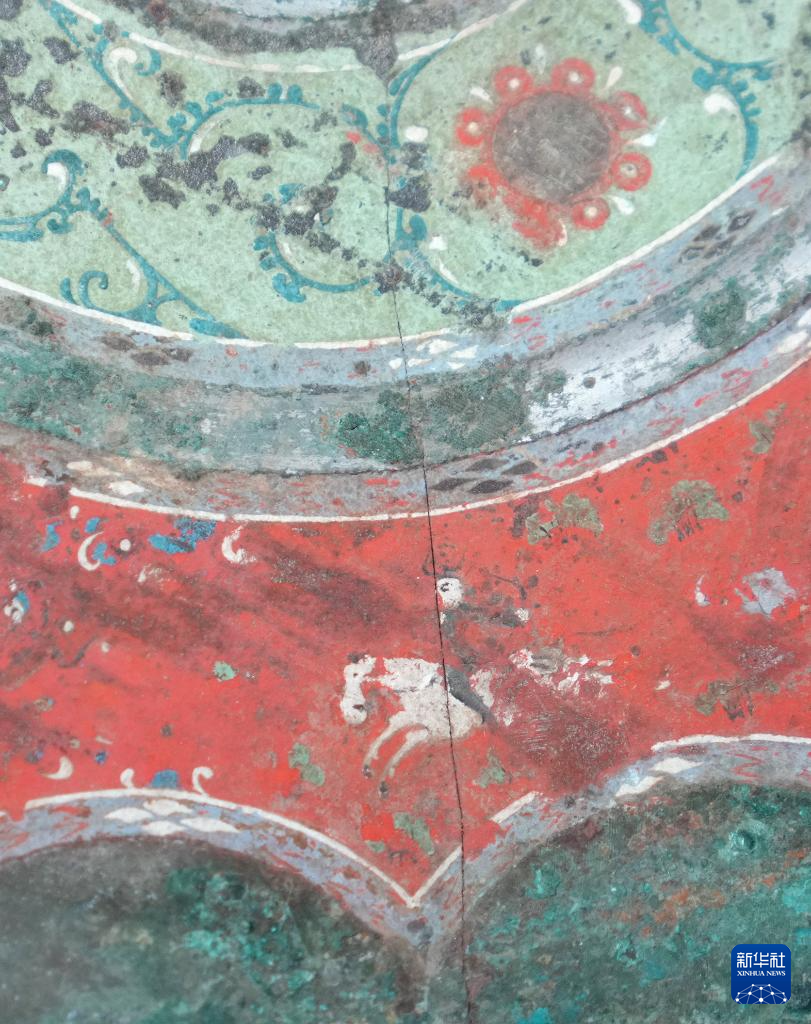 西漢彩繪人物車馬鏡局部彩繪圖案(8月25日攝)。