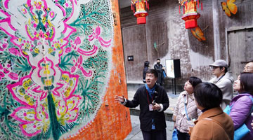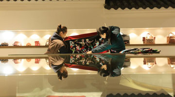 西漢彩繪人物車馬鏡局部彩繪圖案“謁見”(8月25日攝)。