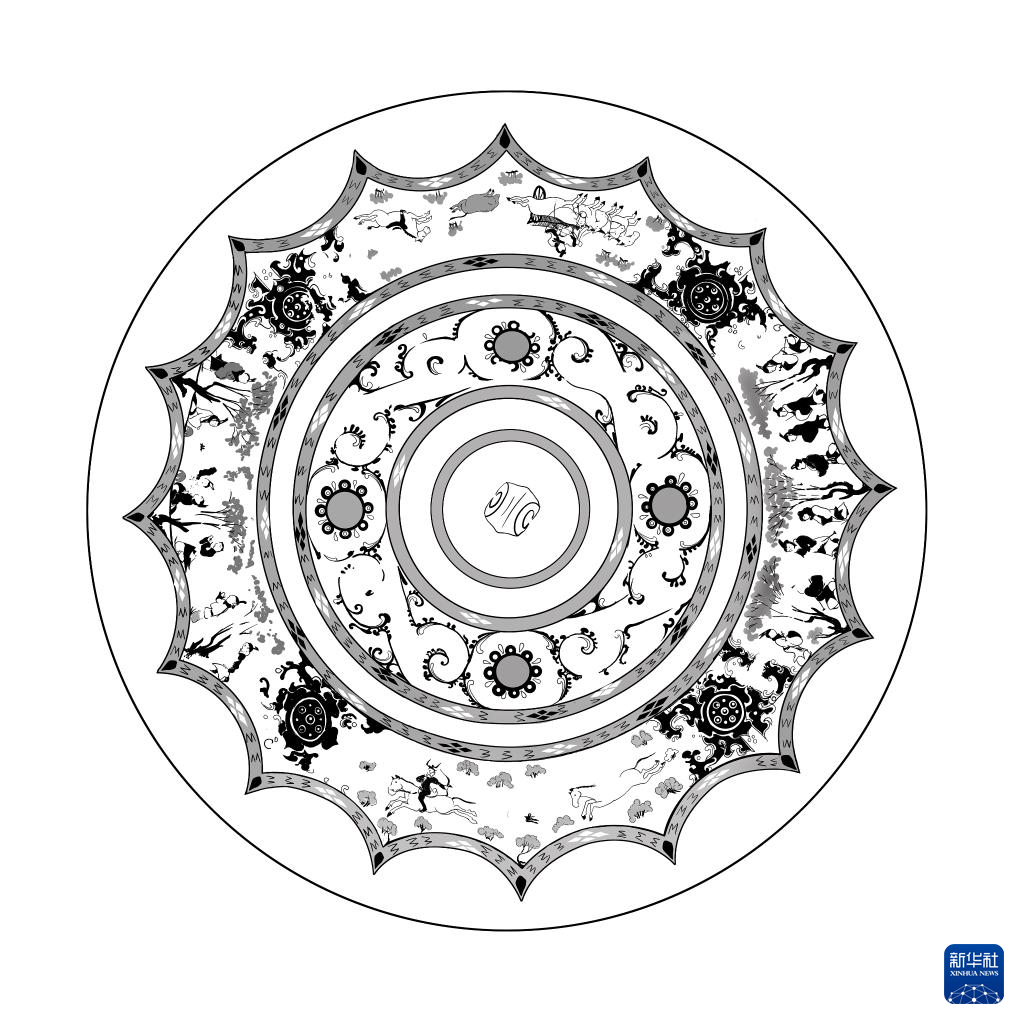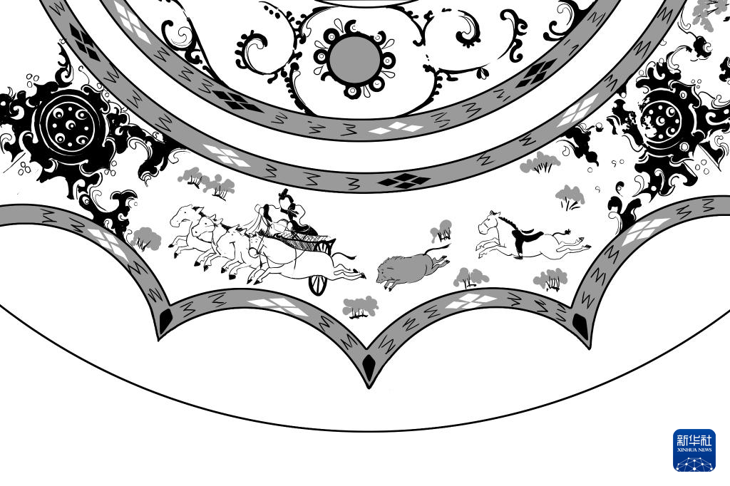 西漢彩繪人物車馬鏡局部“狩獵”圖案線稿圖。