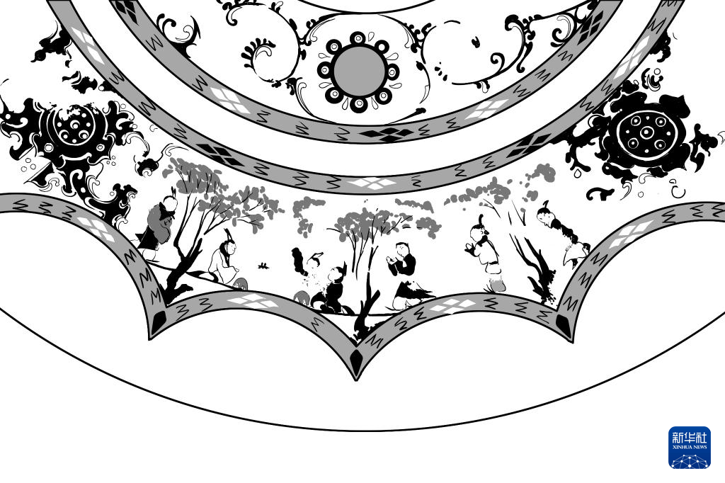 外區:紅色地彩上被四個圓形紋飾分成四區,每個區隔內都繪有若干人物,展現貴族生活場景。經專家研讀,四個區域按順序可確定為出行、謁見、狩獵、宴飲四個題材。
