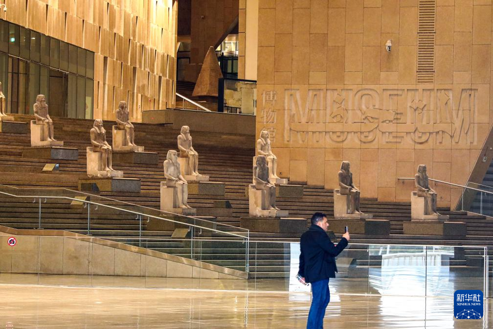 11月20日,一名游客在位于埃及吉薩省的大埃及博物館大廳拍照。