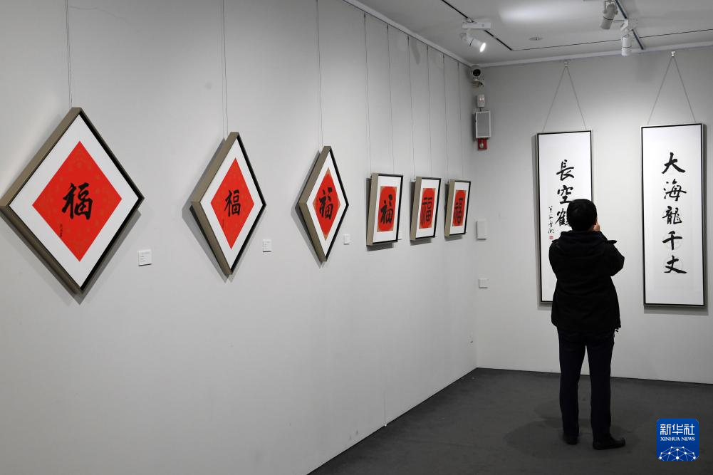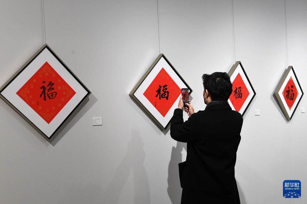 11月26日,參觀者在展覽現場欣賞春聯和福字展品。