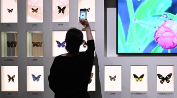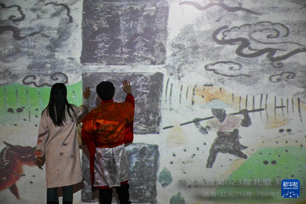 11月28日,在天津數字藝術博物館,觀眾通過數字技術與敦煌壁畫作品互動。