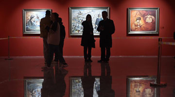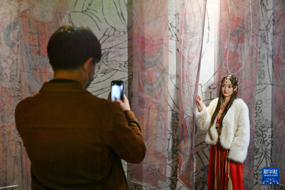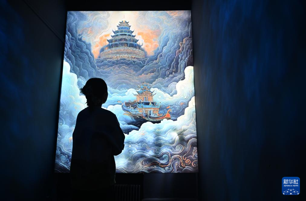 11月28日,在天津數字藝術博物館,觀眾在一幅藝術家重繪的敦煌壁畫作品前駐足欣賞。