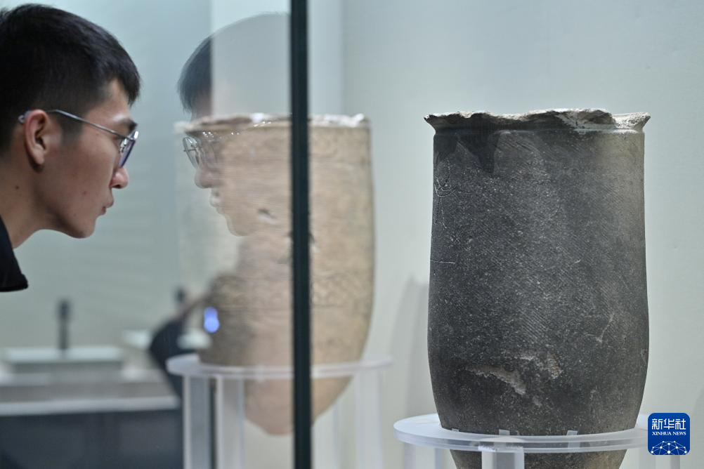 11月29日,參觀者在清華大學藝術博物館觀看大汶口文化時期的刻符灰陶尊(國家一級文物)。