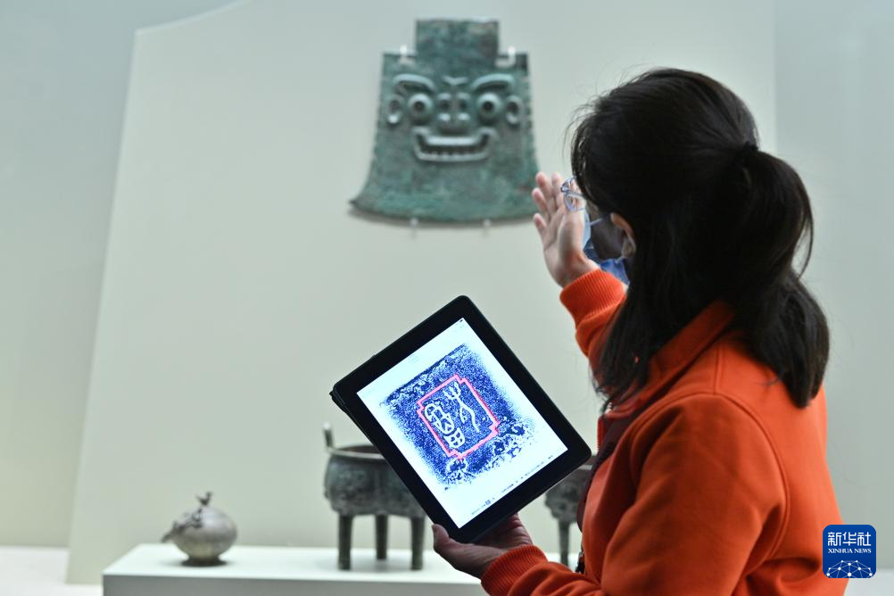 11月29日,參觀者在清華大學藝術博物館觀看山東博物館鎮館之寶商代亞醜鉞(國家一級文物)。