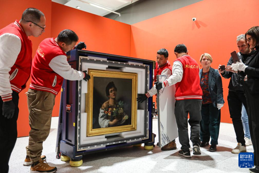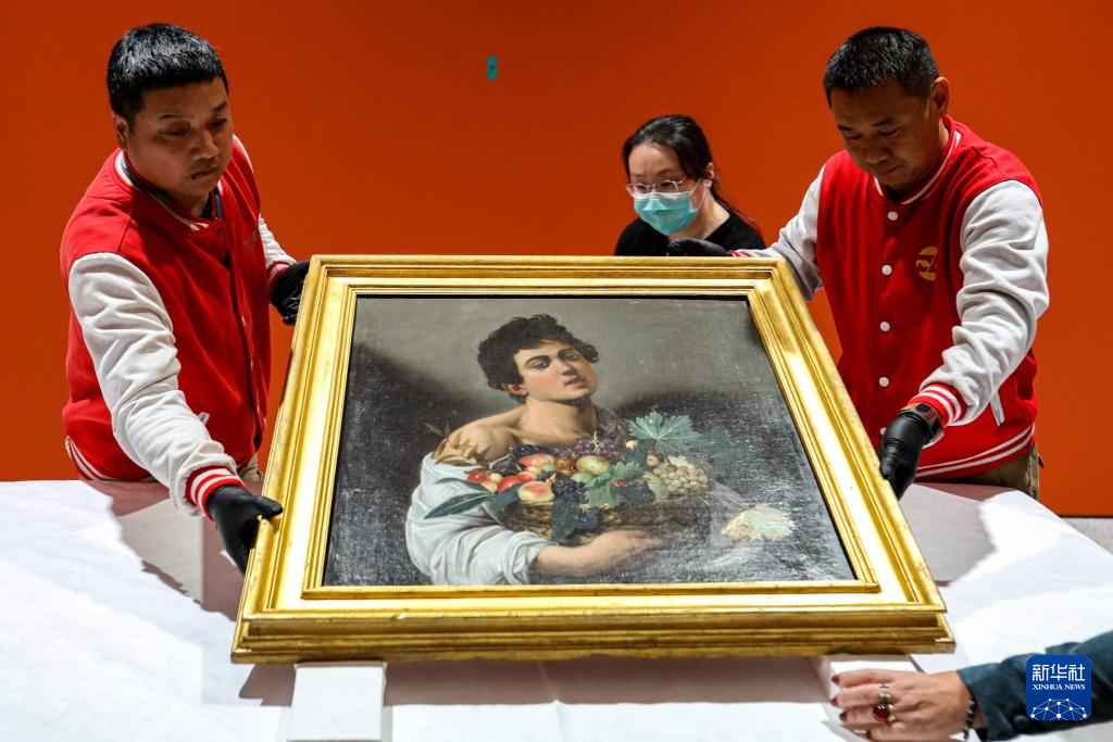 12月8日,工作人員在開箱儀式上展示卡拉瓦喬的作品《捧果籃的男孩》。
