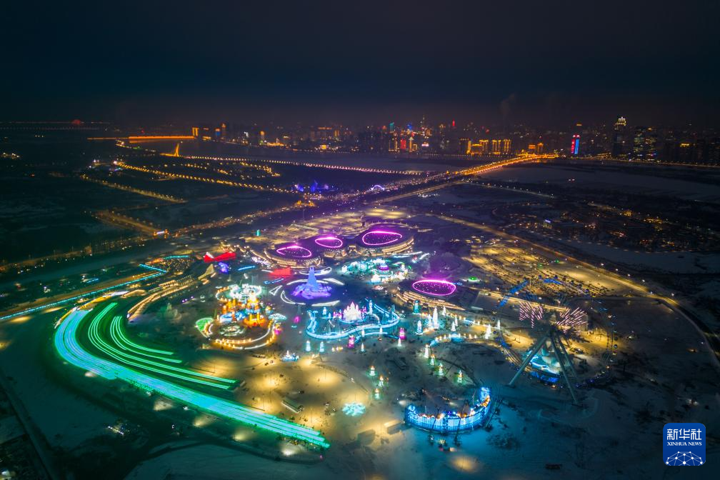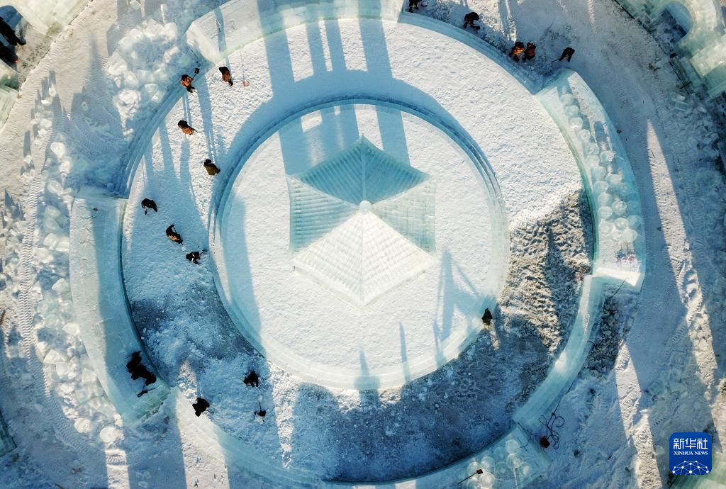 12月14日,工人在哈爾濱冰雪大世界園區建設現場施工(無人機照片)。