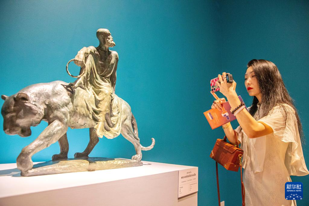 12月27日,一名參觀者在泰國曼谷的泰國國家美術館拍攝雕塑作品。