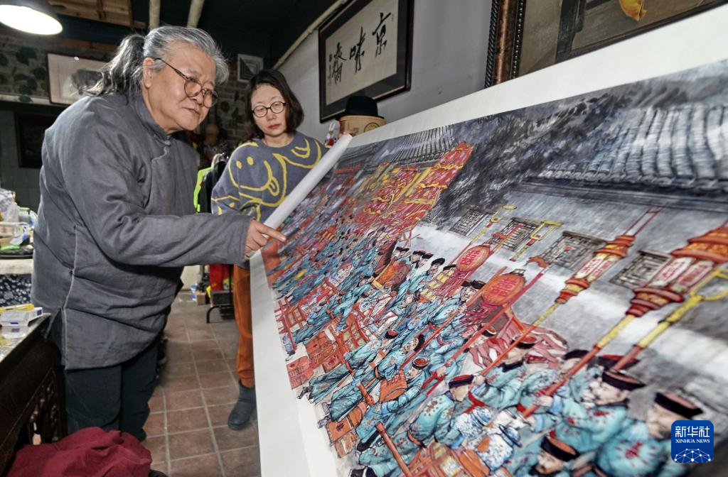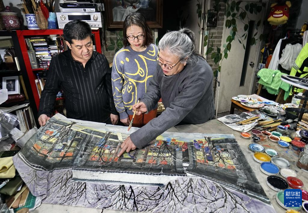 楊信(右)為來訪的繪畫愛好者介紹正在繪制的老北京風情作品(1月4日攝)。