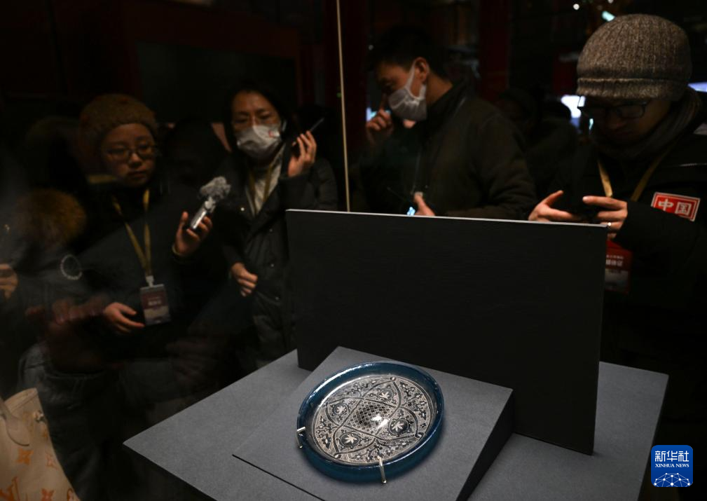 這是展出的陜西法門寺地宮出土唐代刻花藍色玻璃盤(1月10日攝)。