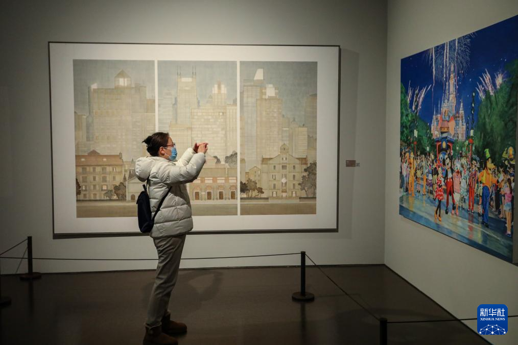 1月12日,觀眾在拍攝畫作《上海迪士尼》。