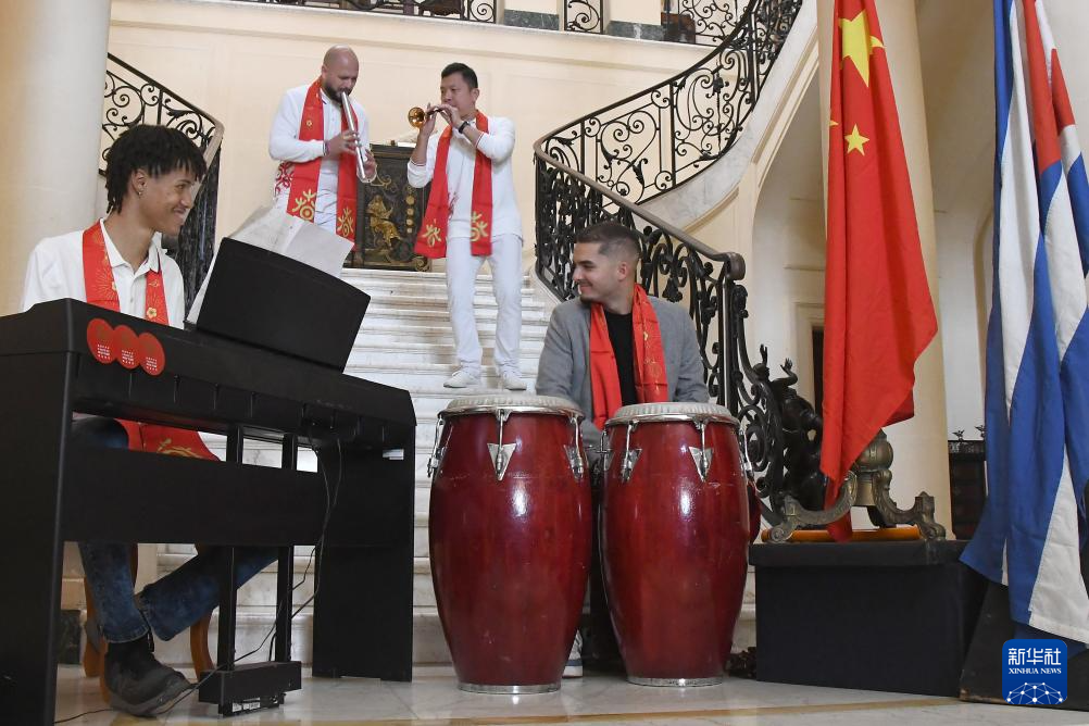 1月18日,在古巴哈瓦那的古巴國家裝飾藝術博物館,中國音樂家與當地音樂家合作演奏。新華社發(華金·埃爾南德斯攝)