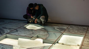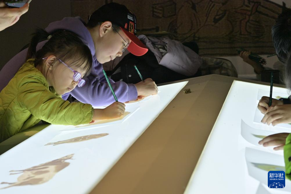 1月24日,小觀眾在“盛世修典‘中國歷代繪畫大系’主題展——‘久久為功’品讀書畫中的中華文脈”展覽現場臨摹古畫。