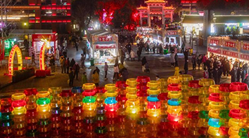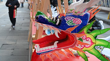 1月31日,參觀者從展覽入口處的龍造型彩燈前走過。