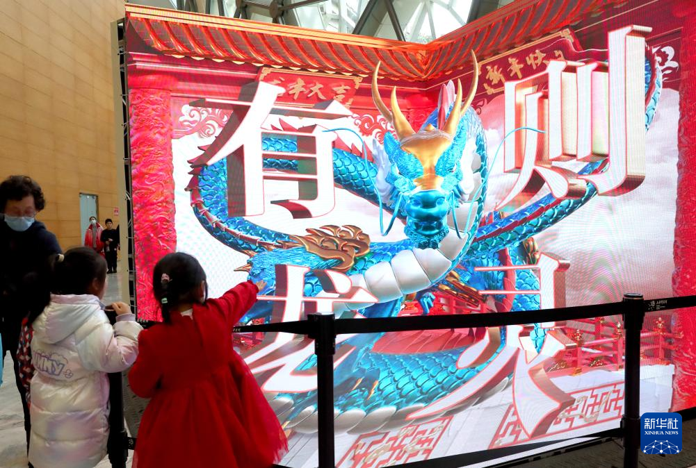 1月31日,小朋友在呈現巨龍立體效果的裸眼3D屏前駐足觀看。