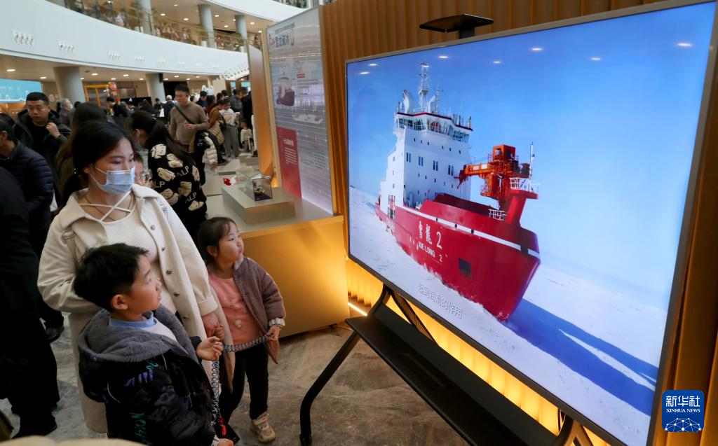 1月31日,參觀者觀看“雪龍2”號科考船宣傳片。
